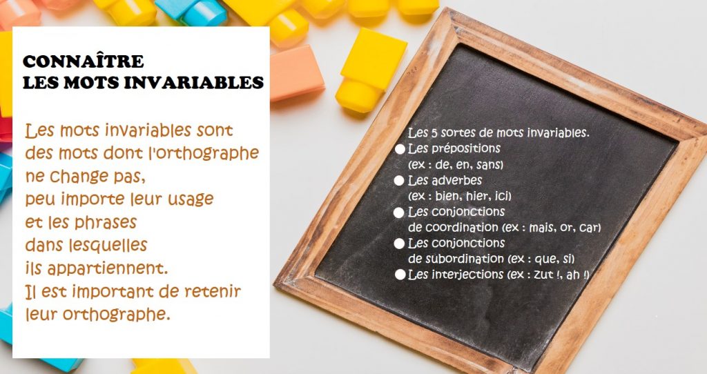 Dans chaque exercice, une série de mots sont proposés et il faut glisser dans l’ardoise les mots invariables.