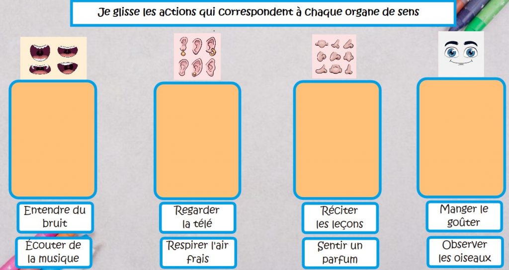 Dans la quatrième page, les enfants identifieront les différentes fonctions des yeux, des oreilles, de la bouche et du nez et vont les classer dans les cases correspondantes :