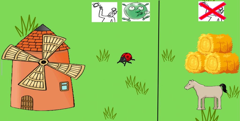 L’exercice incite les élèves à participer au cours en piochant derrière le phare ou le moulin une image à classer. Cette dernière doit être mise dans la bonne colonne (celle contenant le son O ou celle qui ne le contient pas).
