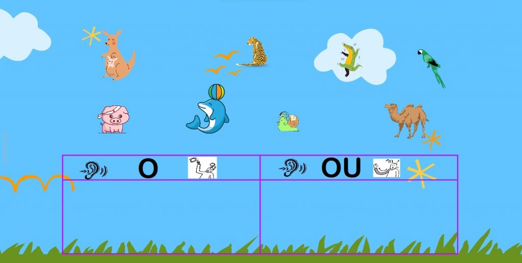 L’exercice incite les élèves à participer au cours en classant une à une les images dans la bonne colonne du tableau affiché à l’écran. En effet, celles contenant le son « O » dans leur appellation sont mises à gauche et celles ayant la sonorité « ou » dans leur dénomination sont classées à droite.