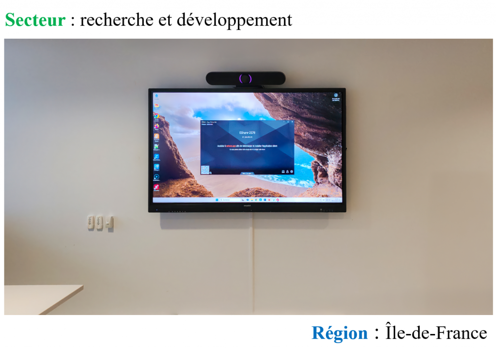 Une société de R&D, dédiée à la transition énergétique et écologique des villes, a récemment équipé son centre de la Seine-et-Marne d’un écran interactif Easypitch avec caméra de visioconférence. Ce centre vise, grâce à ces technologies de pointe, à améliorer l’efficacité de la collaboration avec ses partenaires, la visualisation des données et les démonstrations de solutions innovantes pour la ville de demain, tout en facilitant les échanges entre les acteurs publics et privés.